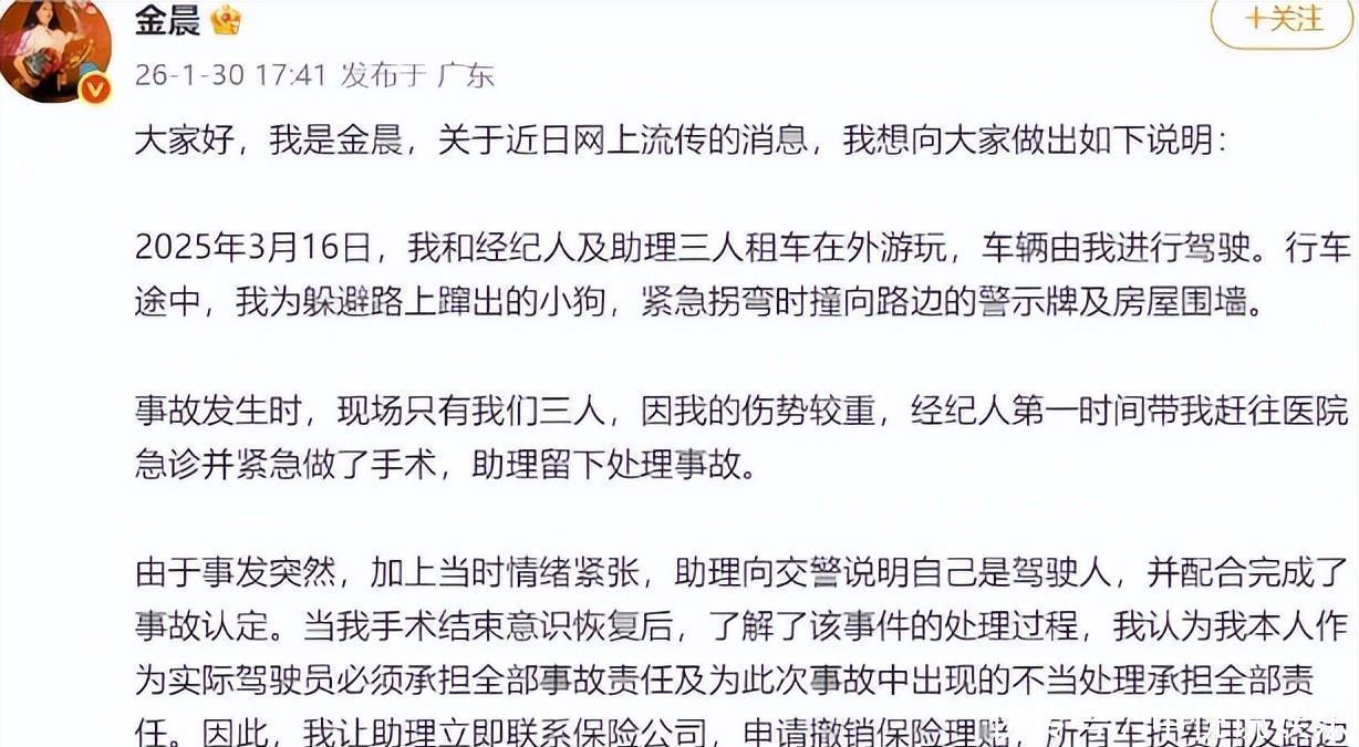 1月30日晚,金晨发微博表态认错,她坦言那天确实是自己开车,还带着经纪人和助理一起出去玩。之所以会出事,主要是因为路中间突然窜出只小狗,为了躲开它,她不得不急转弯,结果才撞上了路边的警示牌和房屋的围墙。