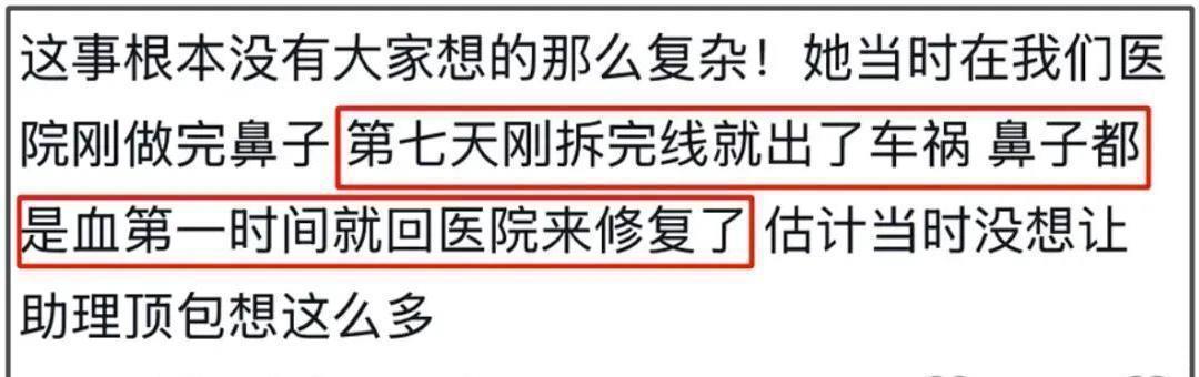 在金晨发文道歉之前,评论区里有个所谓的“知情人”爆料,说当时的情况其实没那么复杂,就是金晨刚在他们医院做了鼻子手术,拆线大概第七天就遇上了车祸。当时因为鼻子血还没止住,所以赶紧又回医院修补一番,估计她也没打算让助理顶包啥的。
